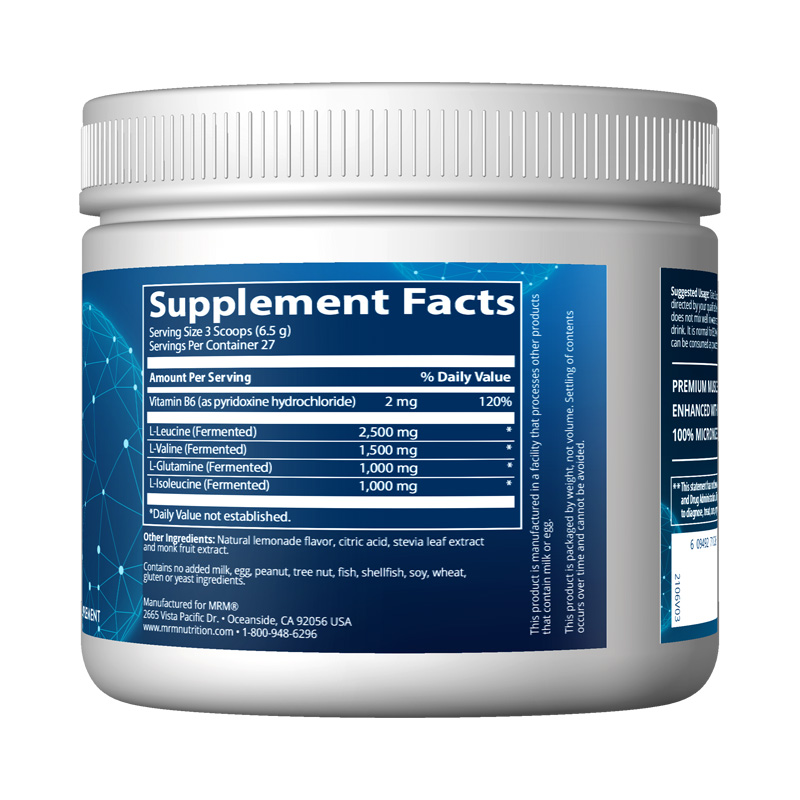 MRM BCAA+G contiene estos tres aminoácidos en proporciones importantes + L-Glutamina y vitamina B-6 como balanceador hormona.