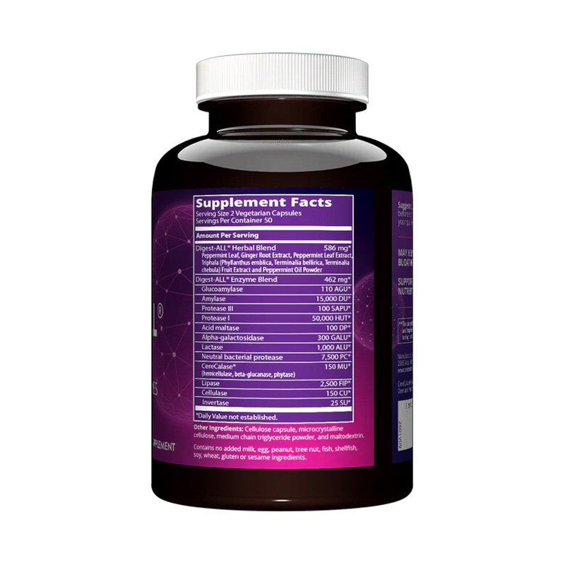 MRM DIGEST-ALL es un compuesto de plantas y enzimas digestivas. Entre las plantas que contiene esta fórmula podemos mencionar, jengibre, trifalia y terminalia chebula – ingrediente principal de la trifalia.