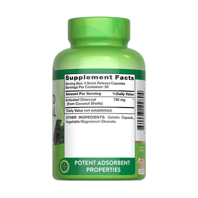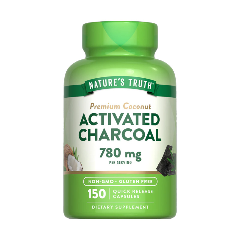 Nature’s Truth Activated Charcoal contiene 780 mg en 3 cápsulas. Elaborado con cáscara de coco.