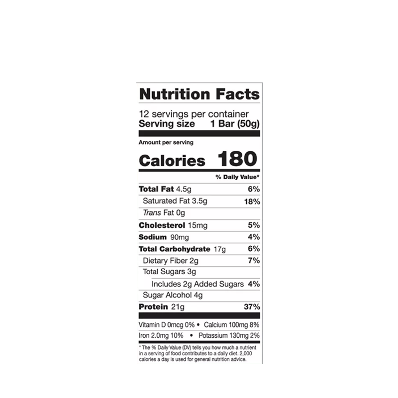 Cada barra contiene entre 19 y 21 g de proteína de suero de leche y entre 180 y 200 calorías. Contienen azúcar, sucralosa y maltitol. Todos ingredientes naturales.
