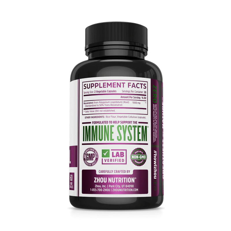 Resveratrol es un potente antioxidante que ayuda a preservar la vida de los telómeros celulares contribuyendo a mantener un cuerpo sano y joven.  Este se encuentra en la piel y semillas de uvas y arándanos para proteger los frutos del efecto dañino de plagas infecctantes.  También se encuentra en la planta japonesa  Polygonum Cuspidatum de la cual se extrae el resveratrol en esta fórmula.