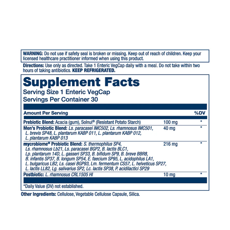 La fórmula Solaray Complete Probiotic Men’s es una combinación de cepas probióticas para nutrir y fortalecer el microbioma intestinal del hombre.
