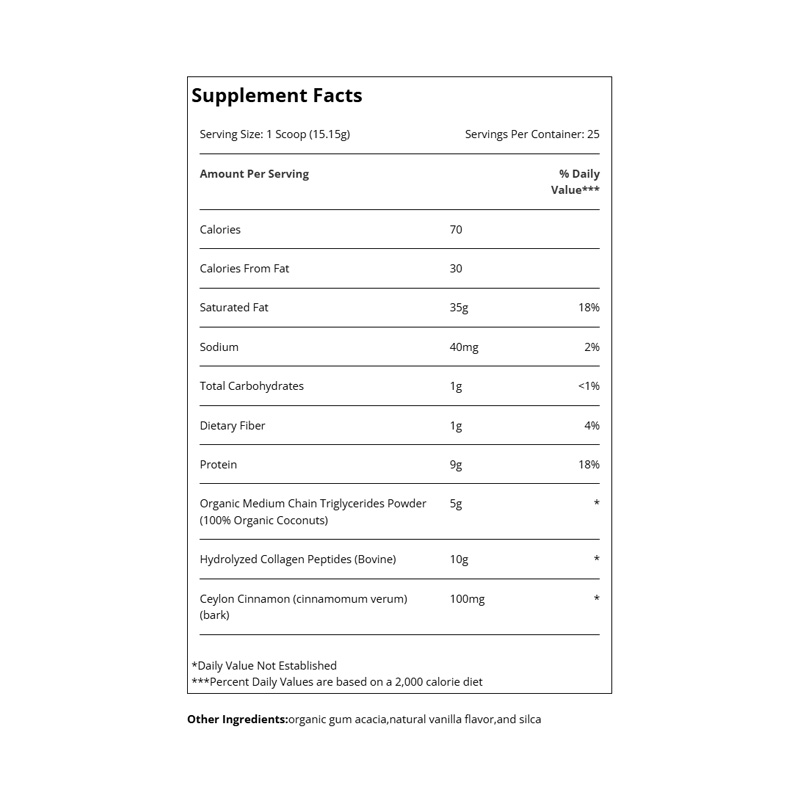 MCT es útil en casos de diabetes ya que ayuda a mantener en balance los niveles de glucosa en sangre y en regímenes para perder peso ya que no se acumula como grasa en el cuerpo. En esta fórmula se encuentra conjuntamente con colágeno hidrolizado de fácil asimilación y canela, otra razón por la cual es recomendada a diabéticos. También contiene fibras prebióticas de la acacia y sabor natural a vainilla.